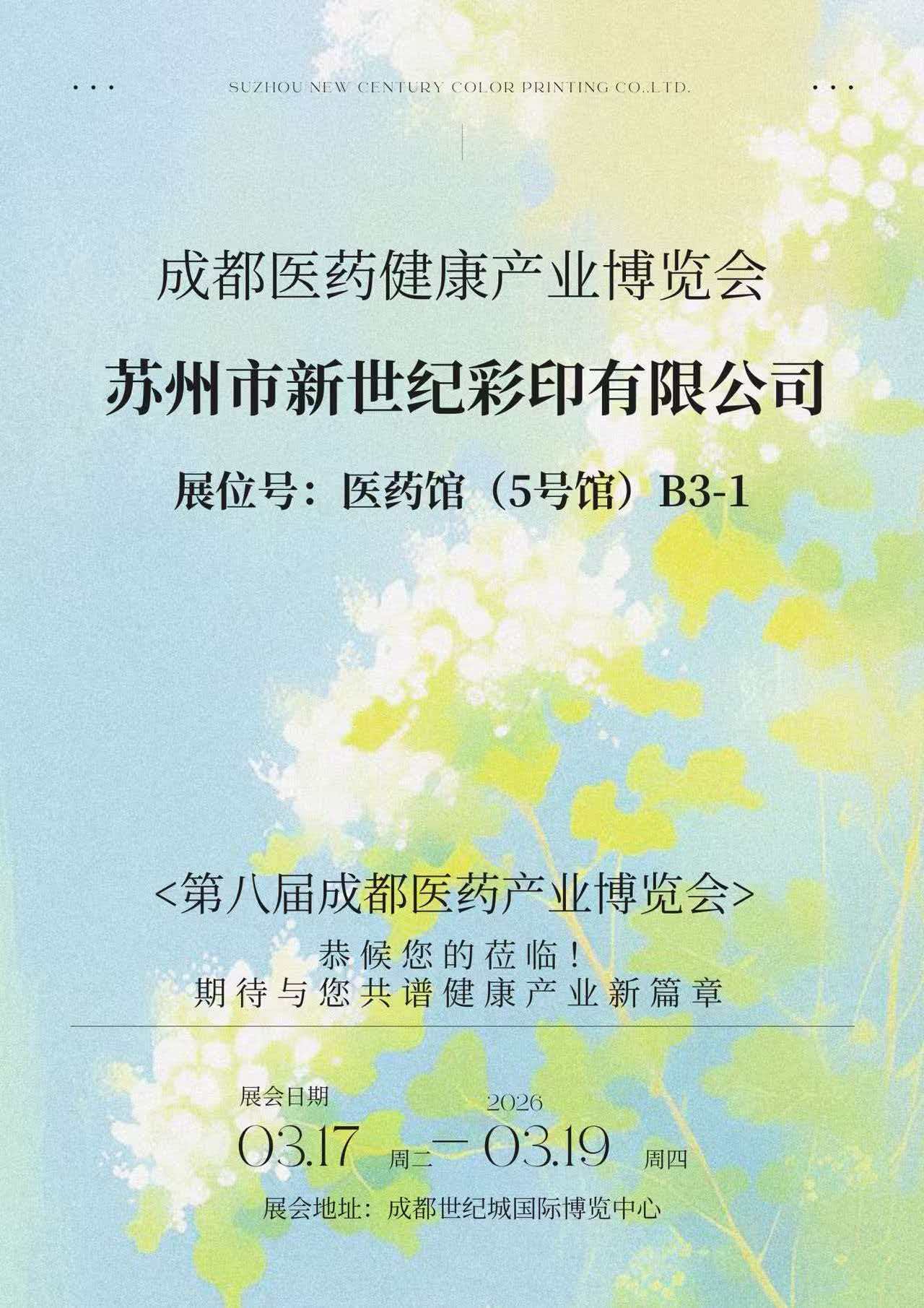 2026. március 17. és 19. között a Chengdu Century City Nemzetközi Kongresszusi és Kiállítási Központban került megrendezésre a 8. Chengdu Orvosi és Egészségügyi Expó. A Suzhou New Century Color Printing Co., Ltd. (a továbbiakban: "New Century Printing") bemutatta legújabb eredményeit a gyógyszercsomagolás területén stand B3-1 a Gyógyszercsarnokban (5. csarnok), átfogóan bemutatva átfogó erejét a gyógyszercsomagolás nyomtatásában, szerkezeti tervezésében és megfelelőségi szolgáltatásokban. Számos gyógyszeripari céget és iparági szakértőt vonzott, hogy megálljanak és eszmét cseréljenek.