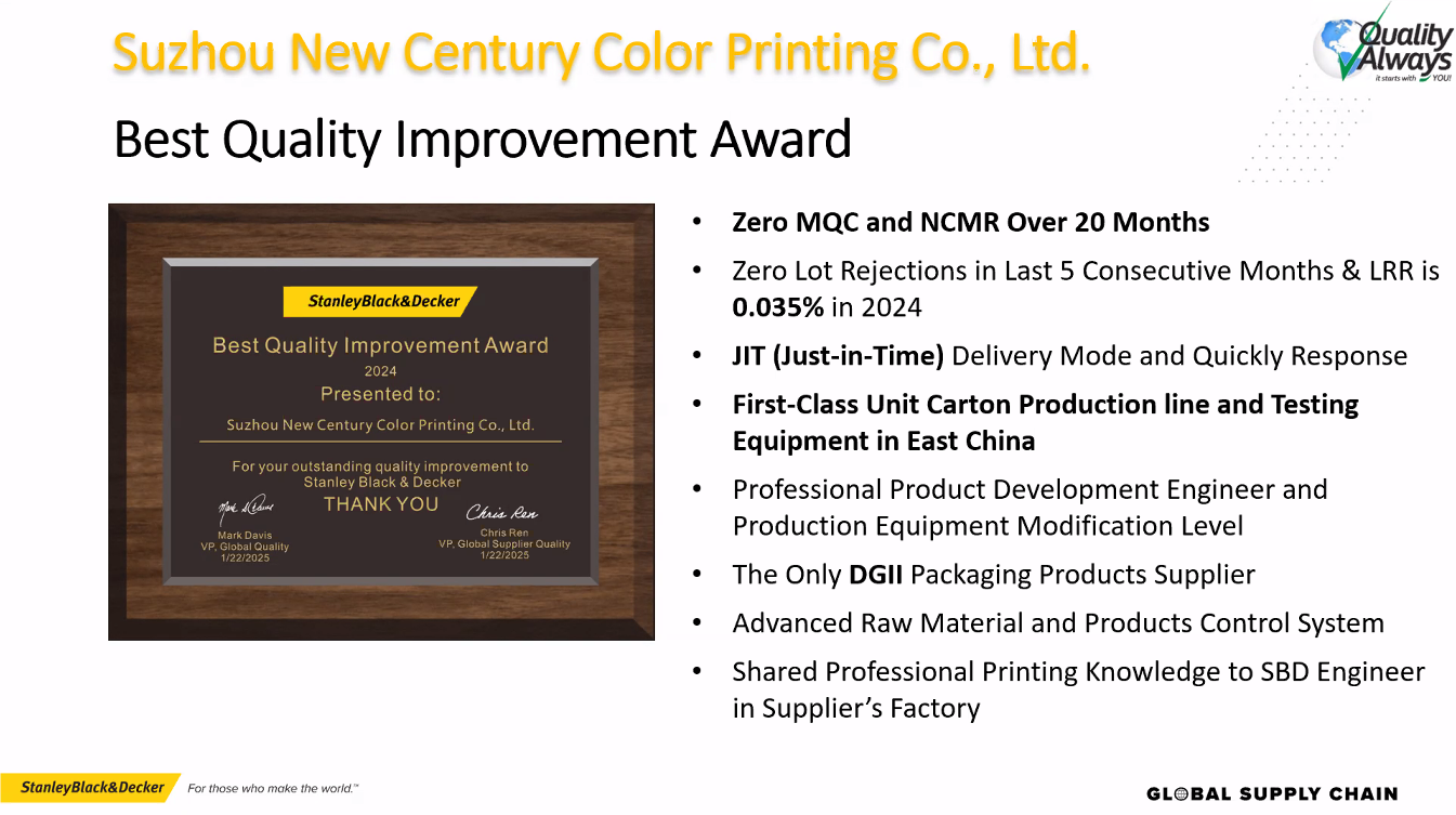 Az elmúlt öt egymást követő hónapban a Suzhou New Century Color Printing Co., Ltd. nulla tétel -elutasításokat tapasztalt, tükrözve annak kivételes minőség -ellenőrzési és termelési folyamatait. Ezenkívül a A tétel -elutasítási arány (LRR) a 2024 -es évre lenyűgöző 0,035% , jelezve egy közel tökéletes eredményt a hibamentes termékek ügyfeleinek történő szállításában.